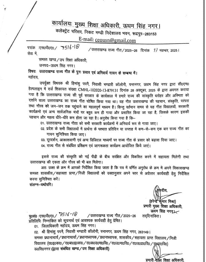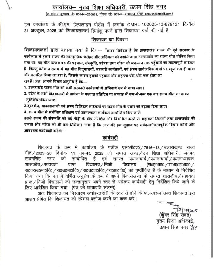 राज्य गीत के अनिवार्य होने से न केवल बच्चों में राज्य के प्रति गर्व बढ़ेगा, बल्कि एक ऐसी पीढ़ी तैयार होगी जो अपनी जड़ों को समझती हो, अपने पहाड़ों से प्रेम करती हो, और अपनी मातृभूमि के प्रति भावनात्मक रूप से जुड़ी हो।