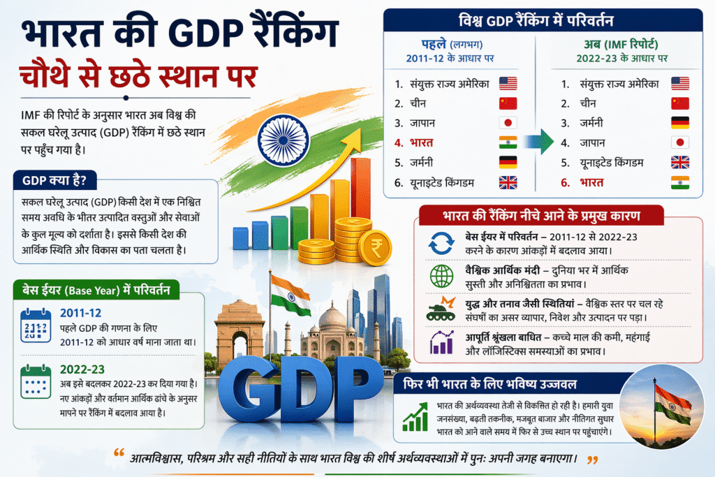 भारत लंबे समय तक विश्व की प्रमुख अर्थव्यवस्थाओं में शामिल रहा है। पहले भारत का स्थान वैश्विक GDP रैंकिंग में चौथे स्थान के आसपास माना जाता था, लेकिन International Monetary Fund (IMF) की हालिया रिपोर्ट के अनुसार भारत छठे स्थान पर पहुंच गया है।