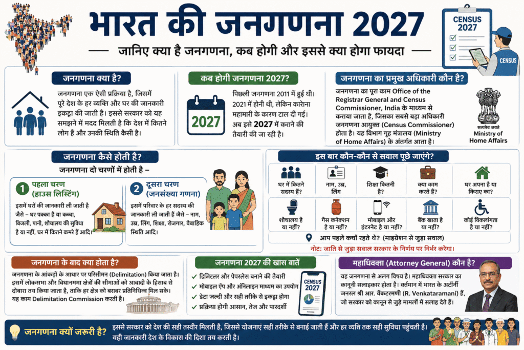 भारत में जनगणना एक बहुत बड़ा और जरूरी काम होता है, जो हर 10 साल में किया जाता है। इससे सरकार को यह पता चलता है कि देश में कितने लोग रहते हैं, उनकी हालत कैसी है और उन्हें किन सुविधाओं की जरूरत है। पिछली जनगणना 2011 में हुई थी और 2021 में होनी थी, लेकिन कोरोना महामारी के कारण उसे टाल दिया गया। अब सरकार 2027 में जनगणना कराने की तैयारी कर रही है, जो देश के विकास के लिए बहुत महत्वपूर्ण मानी जा रही है।