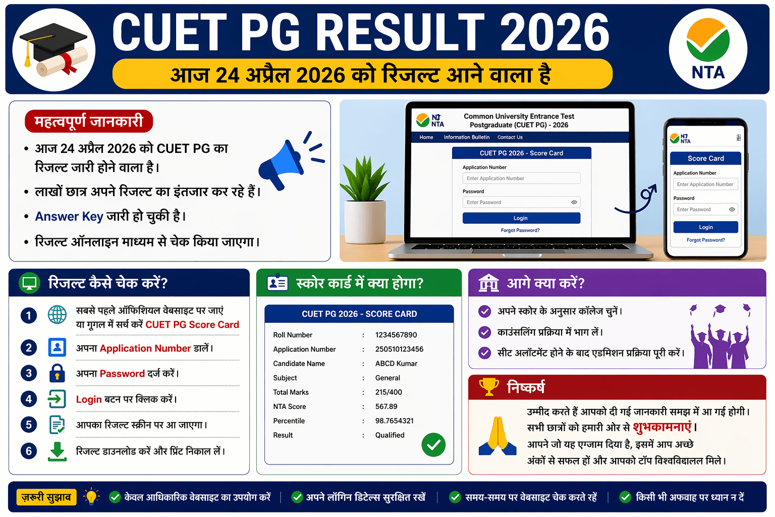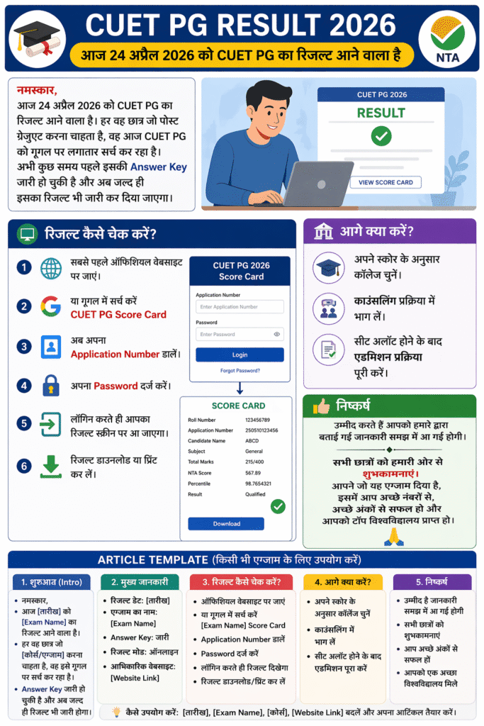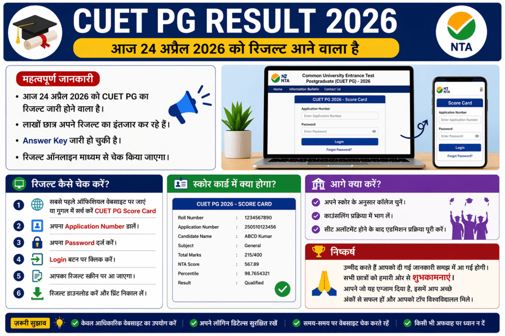 नमस्कार, आज 24 अप्रैल 2026 को CUET PG 2026 का रिजल्ट आने वाला है। हर छात्र जो पोस्ट ग्रेजुएशन करना चाहता है, वह इस समय CUET PG को गूगल पर सर्च कर रहा है। हाल ही में इसकी Answer Key जारी हो चुकी है और अब जल्द ही रिजल्ट भी जारी किया जाएगा।