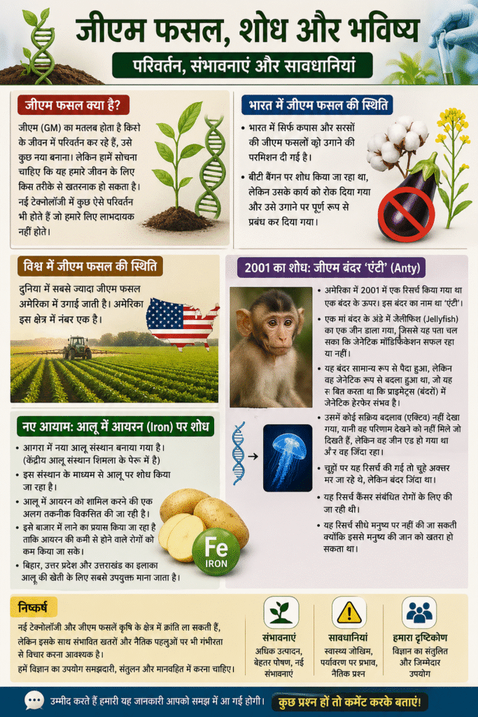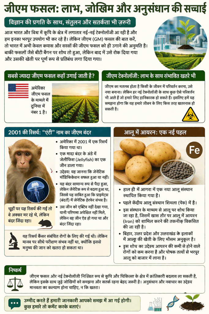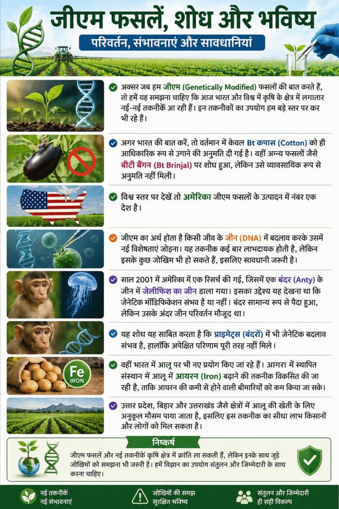 जीएम का अर्थ होता है किसी जीव के जीन (DNA) में बदलाव करके उसमें नई विशेषताएं जोड़ना। यह तकनीक कई बार लाभदायक होती है, लेकिन इसके कुछ जोखिम भी हो सकते हैं, इसलिए सावधानी जरूरी है