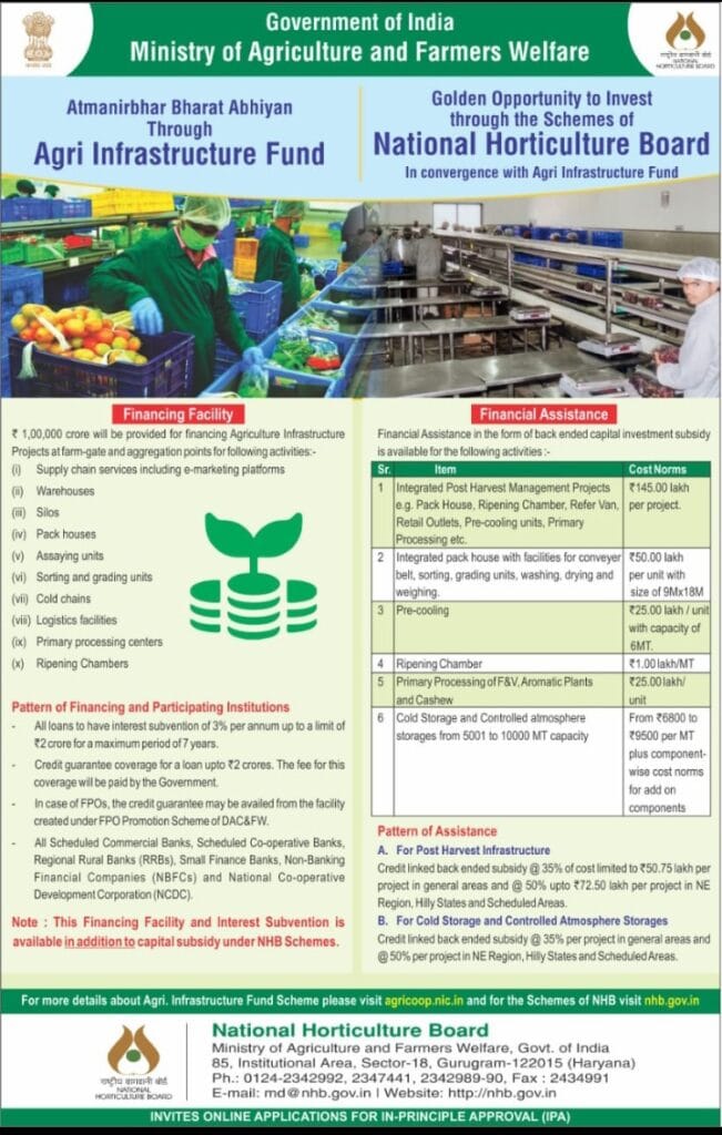 इसका उद्देश्य फसल कटाई के बाद होने वाले नुकसान को कम करना, भंडारण सुविधाओं का विकास करना और किसानों को बेहतर मूल्य दिलाना है। इसके तहत लगभग 1 लाख करोड़ रुपये की वित्तीय सहायता प्रदान की जाती है।